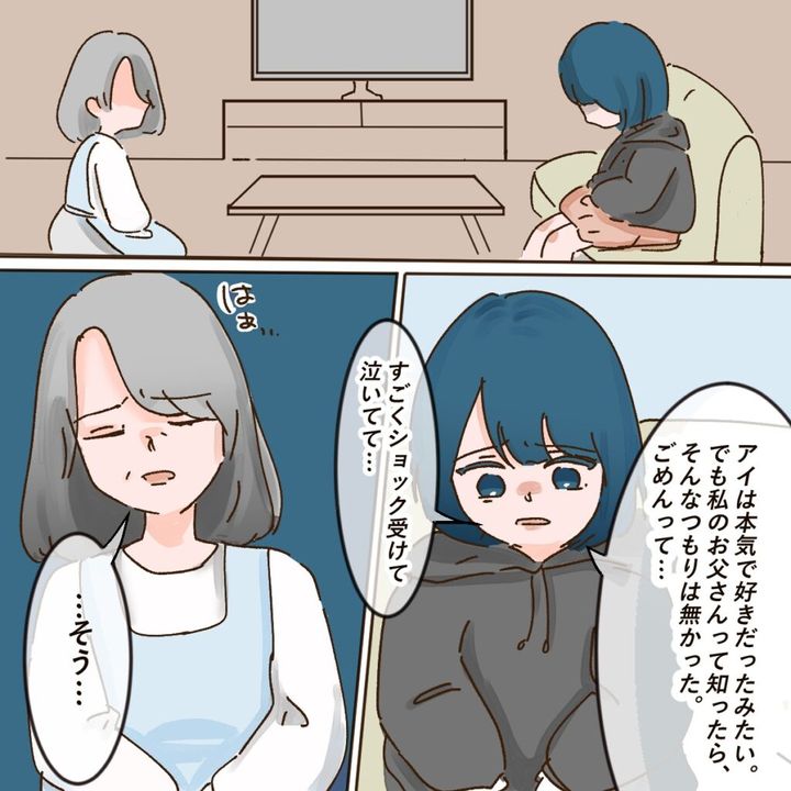 そしてアイのことを話すと、「アイは本気で好きだったみたい。でも私のお父さんって知ったら、そんなつもりは無かった。ごめんって・・。すごくショック受けて泣いてて・・」サキの言葉に「・・そう・・」と言いながら深いため息をつきました。