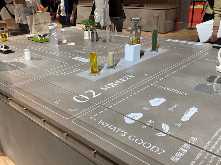 さらに今回は一歩先を行きます。車両の脇に「CO₂TANK」と書かれたタンクと複数の管などで構成された装置が展示されていました。これが二酸化炭素吸収装置、吸着剤を使って二酸化炭素を分離し、タンクに貯蔵する技術です。貯めた二酸化炭素は農作物の栽培やカーボン素材への活用が可能だということです。さらに藻類由来の燃料によって、カーボンニュートラルを超えた「カーボンネガティブ」を目指します。コンセプトカーにも搭載されているということです。