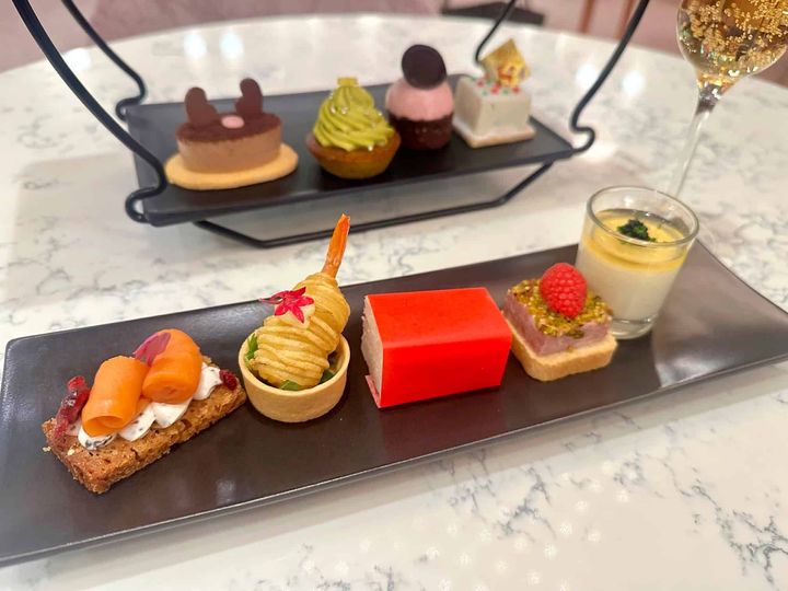 スイーツ下段(奥):左からプラリネクリーム、ピスタチオツリー、ストロベリームースとチェリータルト、フロマージュブランムース セイボリー(手前):左からスモークサーモンとトリュフクリームチーズ、ポテトをまとった小エビのフリット、ハムとチーズのサンドイッチ、パテ・ド・カンパーニュとピスタチオクランブル ラズベリー添え、カリフラワーのフランとコンソメジュレ キャビア添え