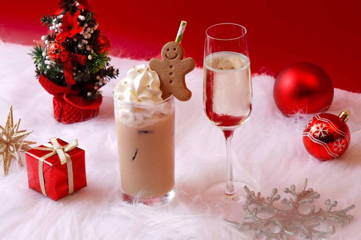 左:アイスジンジャーブレッドラテ ¥1,500 右:シャンパン「モエ インペリアル レッド リミテッドエディション」12月20~25日限定のグラス ¥1,800 *すべてサービス料込