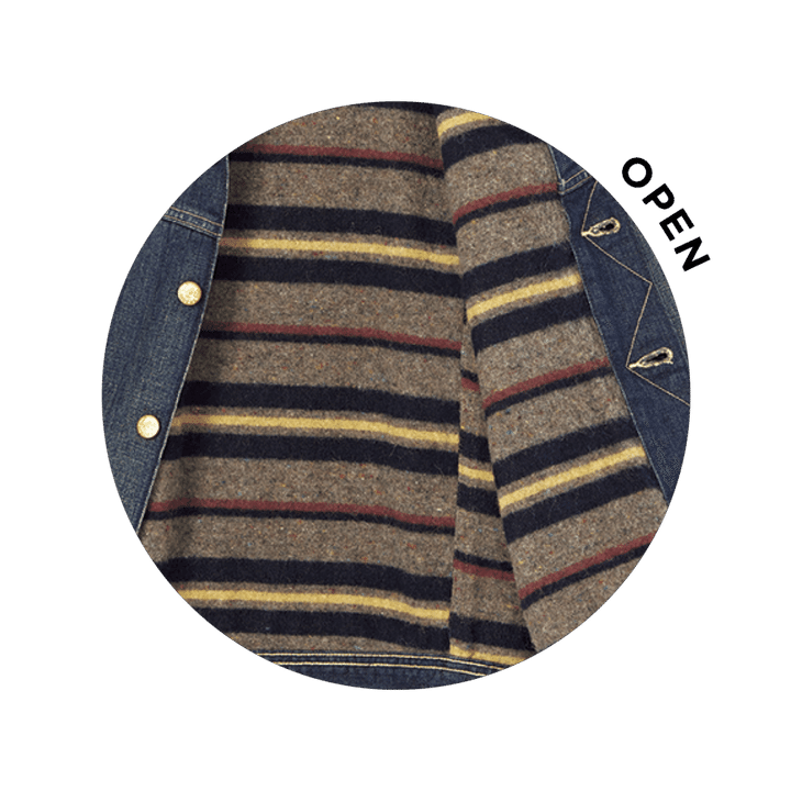 カーハートやバブアーのような、身ごろと襟の素材が異なるワークジャケットブームはデニムにも。女性らしいスカートやモダンなアイテムと合わせれば洒落感UP。