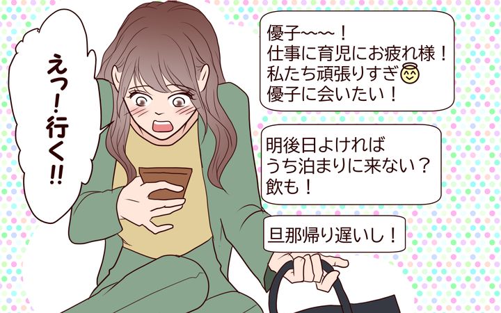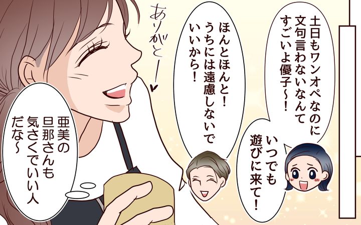 ワンオペ育児に孤独を覚えていた亜美だったが、優子とママ友になったことで育児に仕事に大変ながらも満たされた日々を送っていた。しかし、優子を夫・拓馬に紹介すると、拓馬は美人な優子に夢中になってしまう。
