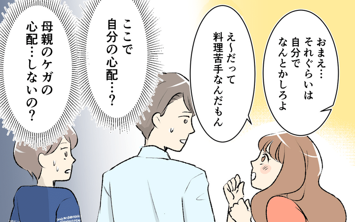 そして、旅行から帰って数週間後…。義母が自転車で転倒し入院。駆け付けた花音は開口一番、母親の心配よりも「誰が私たちのご飯作るの?」と聞くのだった。