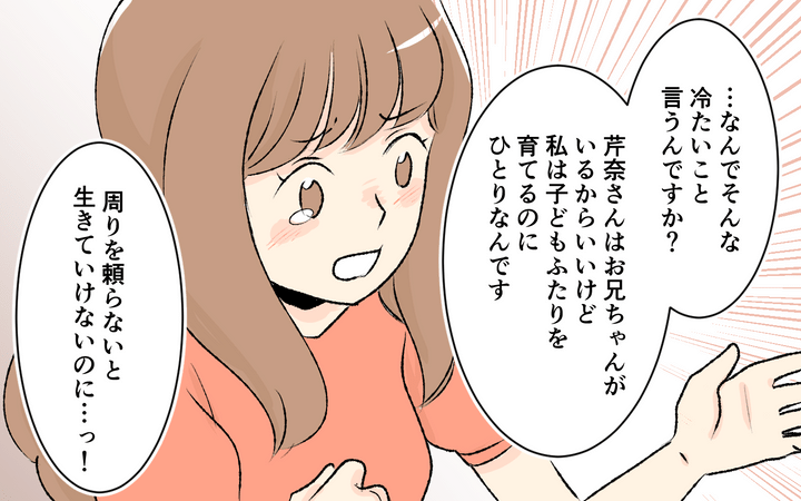 芹奈は夫・優太の妹・花音の甘ったれた振る舞いが苦手だ。義妹は離婚してシングルマザーになったのに仕事も探さず、母親と兄に依存して暮らしている。花音からねだられるものをすべて買い与えるのはおかしいと芹奈が主張しても、夫は妹の味方ばかりするのだった。一緒に旅行に行くことになっても、花音は子どもを母親に預けて買い物にでかけ、兄に大量のお土産を買わせるなどわがまま放題。見かねた芹奈は義妹と距離を置くことに。芹奈のいら立ちに気付いていた義母は、早くに夫を亡くし、花音を大学に通わせられなかった負い目のせいで、花音をわがままに育ててしまったと話し、芹奈に謝罪した。