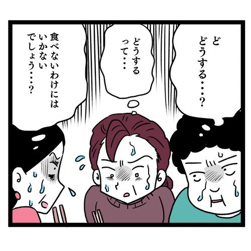その後、栄美がおかずを捨てたと義母は真逆の話を近所に吹聴します。しかし話を聞いた近所の人たちは、栄美の行動も無理もないと思っている様子。それというのも、以前近所の人たちで持ち寄りパーティーをしたときのこと。義母は大量の料理を持ってきたのですが、一口食べた鈴木さんは一瞬意識が飛んでしまい…?