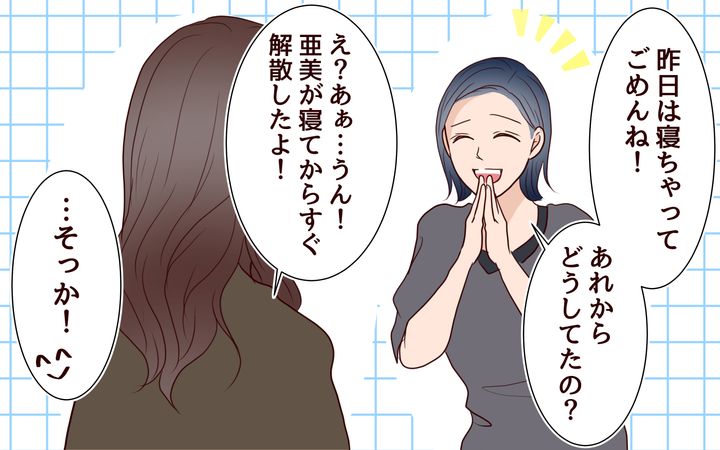 夜になり、子どもたちが寝たあとに3人で飲むことになったのだが、亜美はつい飲み過ぎてしまって…。