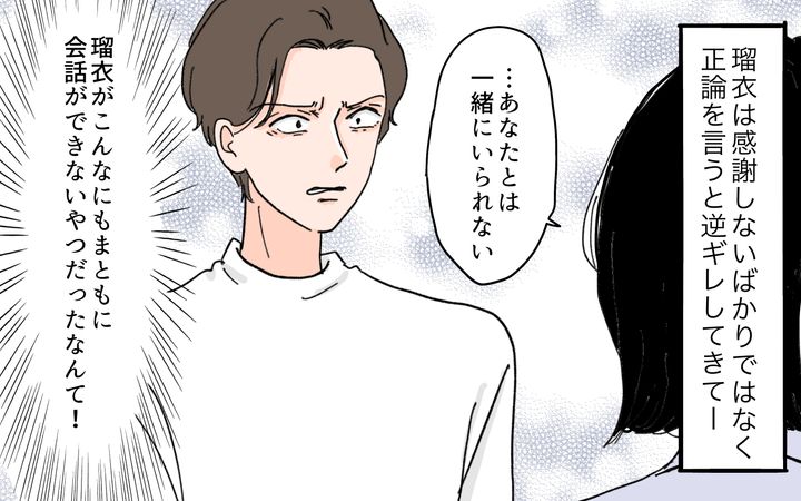 瑠衣の夫・蓮はインフルエンサーの「シズク」を妄信している。妻や娘・奈子をシズクと比較するばかりで家事育児には参加せず、一向に家族に寄り添おうとしない夫との生活に瑠衣は限界を感じ始めていた。家庭内別居のような状態が数カ月続いたある日、瑠衣は夫の部屋で夫とシズクが映った写真を見てしまう。ふたりの関係を疑う瑠衣は証拠を掴もうと夫を追跡し、シズクのマンションにたどり着くが…。シズクは夫の元カノだった。蓮の束縛がひどくて10年前に別れるも、シズクの出産後に蓮の方から接触し、ストーカー化しているという。夫の迷惑行為を謝る瑠衣に、シズクは「このまま夫婦でいたいですか?」と問いかけ…。