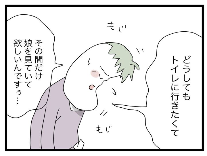 突然見知らぬパパさんに「娘を見ていてほしい」と言われたシズカ。事情を聞くと、パパさんが「トイレに行きたい」ので娘を預かってほしいのだそう。