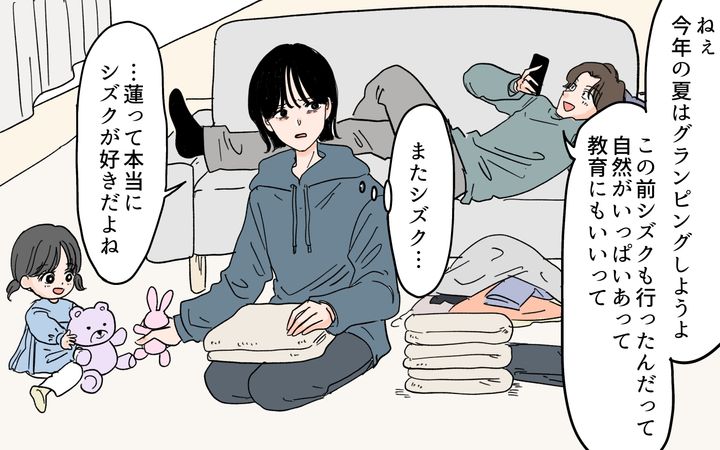インフルエンサーの「シズク」と同じ生活を追い求める夫・蓮。娘・奈子とシズクの子どもを比較し、違うところがあると妻の瑠衣の努力不足と決めつけるくせに、夫は育児にはまったく参加しなかった。我慢の限界を超えた瑠衣が反発すると、夫は部屋に引きこもってしまって家庭内別居状態に。数ヶ月後、夫は突然謝ってきたが、それもシズクが子育ての苦労を発信した影響だった。
