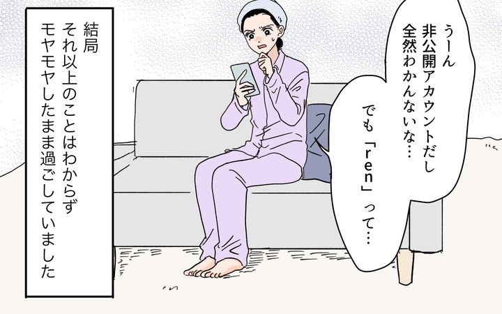 さすがにシズクの存在が気になった瑠衣。検索してみると、夫が謝罪してきた時期に、シズクが育児の大変さを綴っていたことがわかった。さらにもうひとつ、シズクのアカウントに毎日コメントを残している「ren」という人物に気づく。これはまさか…!?