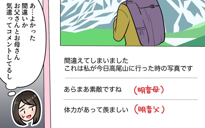 お義母さんが間違えて投稿した自撮り写真に、私の両親が気を遣ってコメントを書き込んでいました。すると、それがよっぽどうれしかったのか、その後、息子の成長とは無関係な写真を率先して投稿するようになったお義母さん。しかも、ツッコミづらい自分語り付きで…。