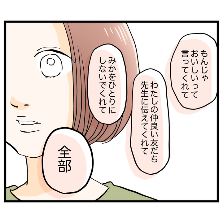 主人公はみかちゃんママに苦手意識がありますが、彼女もまた自分の娘が主人公の話ばかりして辛かった気持ちを吐き出しました。みかちゃんが自分の話をするのは、ただママとしゃべりたいからだと主人公が伝えると、落ち着きを取り戻したみかちゃんママは主人公を食事に誘うのでした。