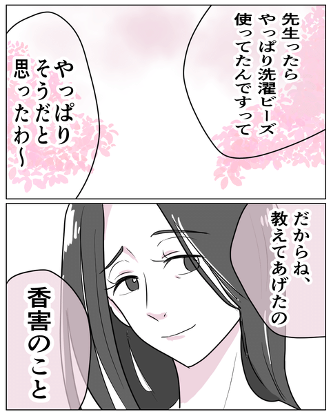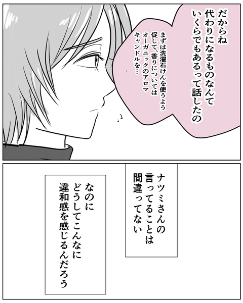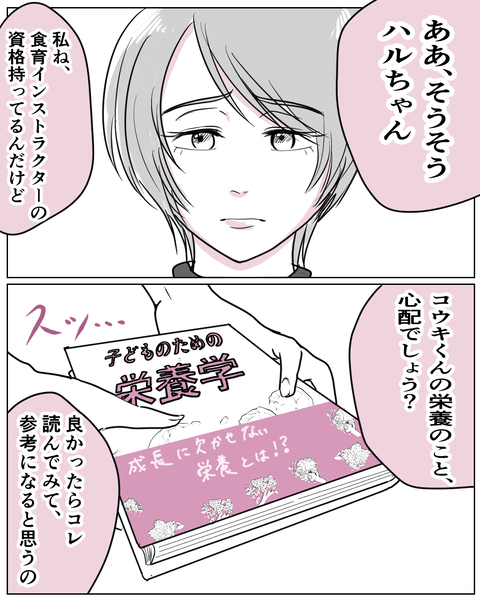 その後も、偏食に悩むハルに「コウキくんの発達がゆっくりなのは鉄分不足では?」と言ったり、香りが強めの先生に直接注意したり…。ナツミに対して「正しい知識を伝えること=正義」だと思っているんだと感じたハルは、距離を置きたいと考える。しかし翌日にも「このあと時間ある?」と声をかけられて…。