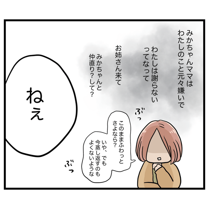 ついさっきまでみかちゃんママに「大嫌い」「謝って」と言われてたのに、みかちゃんママのお姉さんが来たことであやふやになってしまいました。