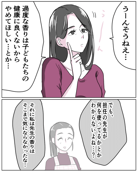 話を聞いた夫は、「俺は自然派食品だろうがジャンキーだろうが、美味くてみんなが笑顔になったら、もう健康だと思ってる」と感情的に自論を展開。そして翌日、ハルは幼稚園でナツミから「担任の先生の匂いがキツくない?」と声をかけられる。匂いによって頭痛や吐き気を催すこともあると、香害について説明されて…。そして、「本人に言うか、園長先生に言うか、どう思う?」と相談されたのでした。