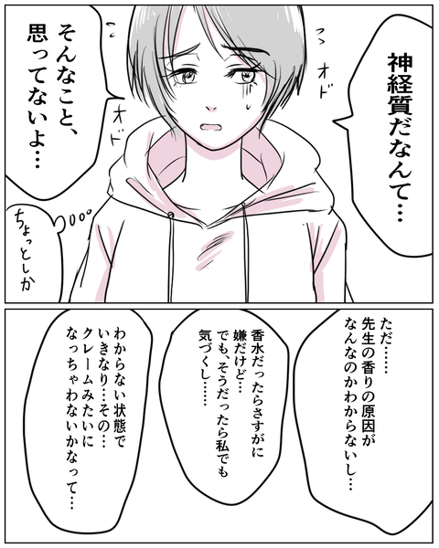 ※作者は香害の実態を全て把握してるわけではありません。香害に苦しむ方は実際にいらっしゃるため、洗剤や柔軟剤を変更するよう促す行為そのものが行き過ぎた行為であるとは限りません。ナツミというキャラクターへの違和感を募らせる描写ですのでご了承ください。