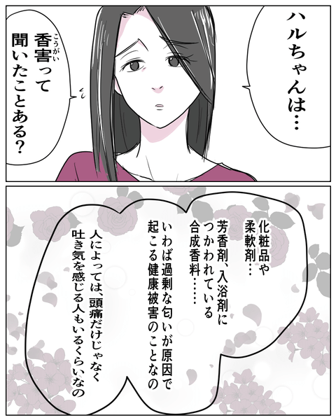 ※作者は香害の実態を全て把握してるわけではありません。香害に苦しむ方は実際にいらっしゃるため、洗剤や柔軟剤を変更するよう促す行為そのものが行き過ぎた行為であるとは限りません。ナツミというキャラクターへの違和感を募らせる描写ですのでご了承ください。