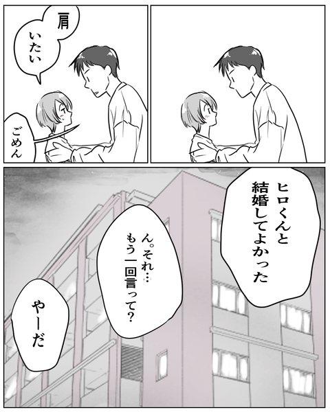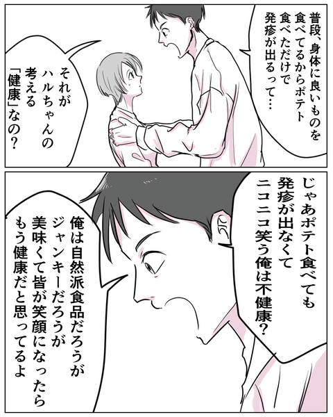 しかし、ナツミの家に遊びに行ったハルが「昼食はファーストフードで買ってきた」と伝えると、ナツミは「夫が娘にフライドポテトを食べさせたら発疹が出た」といい、「日常的に食べさせるのはよくない」「自分の身体は食べられたもので作られているから…ね?」とほほえむ。