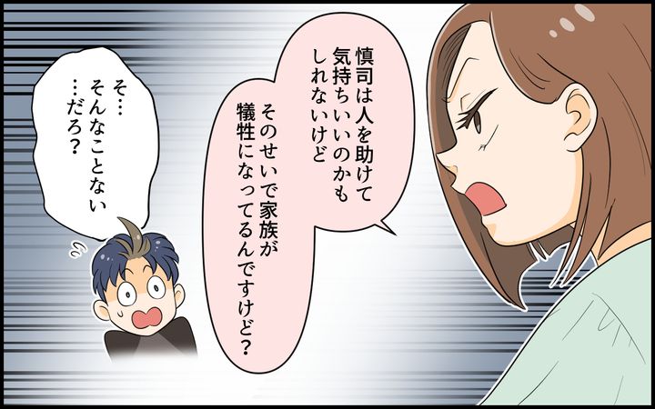慎司は人助けをする自分に酔っているのだと思います。人の役に立つことを気持ちよく感じているのでしょうが、家族を巻き込んでまですることなのでしょうか?