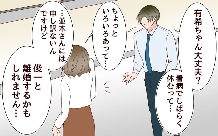 並木さんは俊一の行動がおかしい、悪いのは俊一だから俺がガツンと怒ると言ってくれましたが、私はもう何も話す気になれず…。俊一から連絡やメールがきても無視しました。そんな時に、先輩から電話がきて…ずっと話さなかった夫の過去を聞くことになるのです。