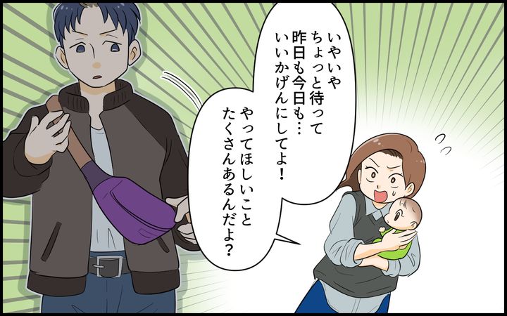 慎司は友だち思いで面倒見がいい性格。そんな性格に魅力を感じて真衣は慎司と結婚したが、いざ家族になってみると、子育て中の妻よりも友だちを優先する夫の言動にうんざりしていた。インフルの友だちのところへ様子を見に行くと言っては、真衣が作り置きしておいたおかずを勝手に持ちだしたり、なかなか帰宅しないと思ったら、おばあさんを助けていたりとマイペース。慎司は人助けをする自分に酔っているようだった。