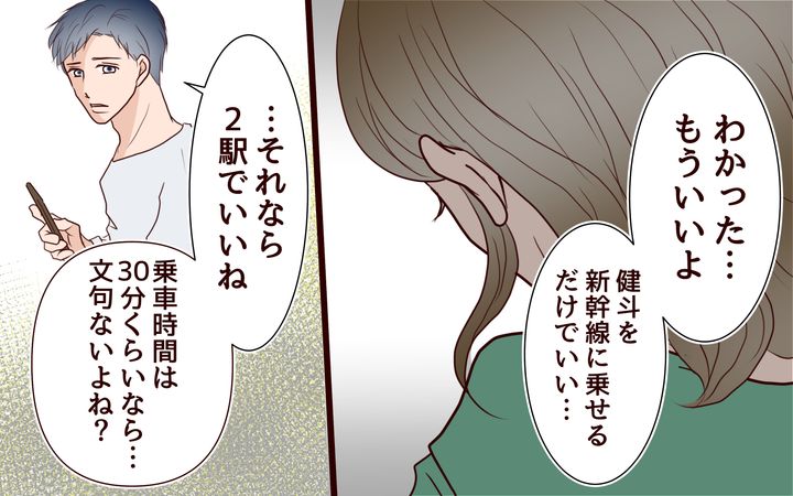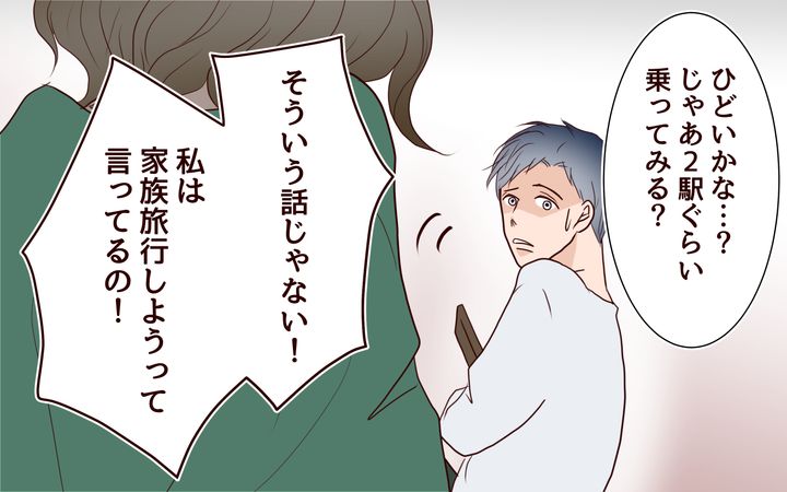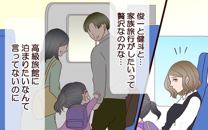 有希が仕事に復帰した後も外食も旅行もできず、遊びに行くといえば近所ばかり。新幹線に興味を持ち出した息子を旅行に連れていきたいと有希が温泉旅行を提案すると、俊一は温泉は不要で、新幹線に乗りたいなら1駅だけ乗ればいいと言うのだった。