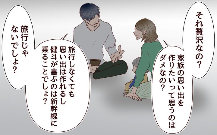 夫には家を購入したんだから、家族旅行は贅沢だと言われました。旅行したいのは私であって、息子の希望ではないと言い切られたら、返す言葉はありません。もういいと投げやりになった私。誕生日に息子を新幹線に乗せることで了承しました。