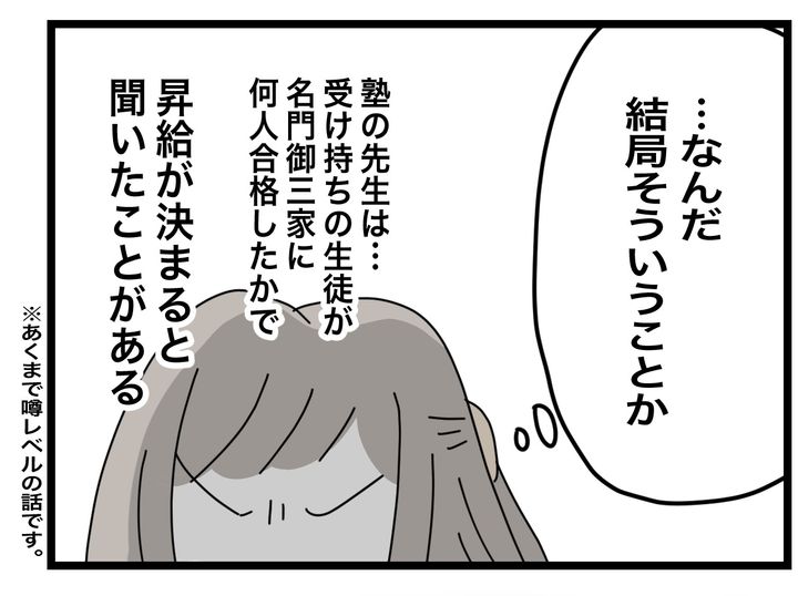 受け持ちの生徒が全員高い偏差値の学校に入るというのがこの先生にとって重要で、先生が誇れない中学を受験する生徒は、もしかしたら先生にとって邪魔な存在だったのかもしれません…。