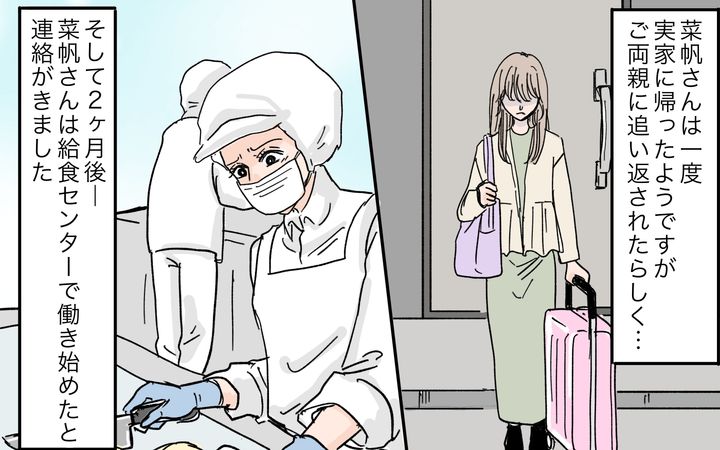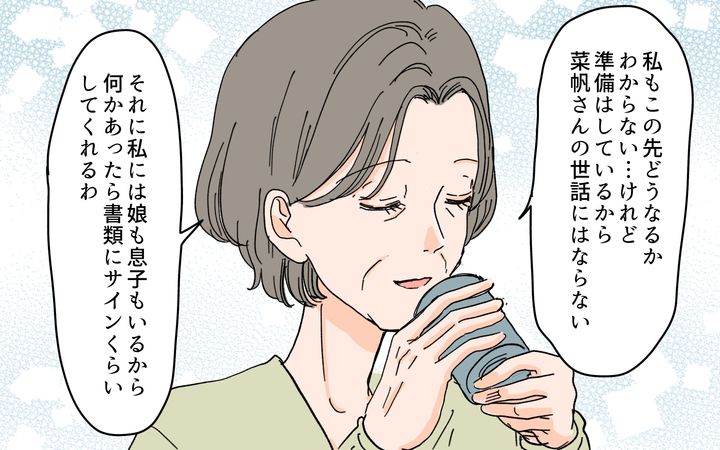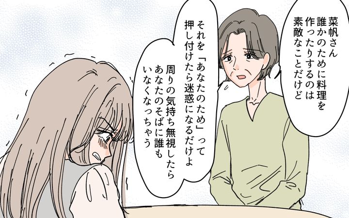しかし菜帆は、自分が家のことをやれば義母を助けることになると譲らない。そこまで誰かのために料理を作りたいならとボランティアを勧めるが、「なんの得にもならない」と一蹴する。自分の得しか考えていないことを加奈が問い詰めると、菜帆は「そんなこというならお義母さんの老後の面倒は見ません!」と告げる。