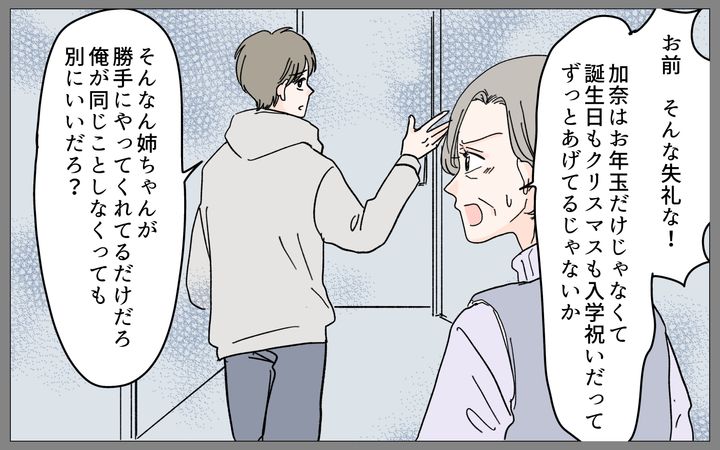 娘の加奈は、昔から自分ひとりで解決してしまうタイプで、母である私にも相談することはありませんでした。良平の方が早く結婚し、子どもも早く産まれたために、加奈は独身時代から良平の子どもたちに贈り物をしてきました。加奈が結婚し、子どもができてからは良平も同じように加奈の娘の美夏ちゃんに対して贈り物をしているとばかり思ってきました。
