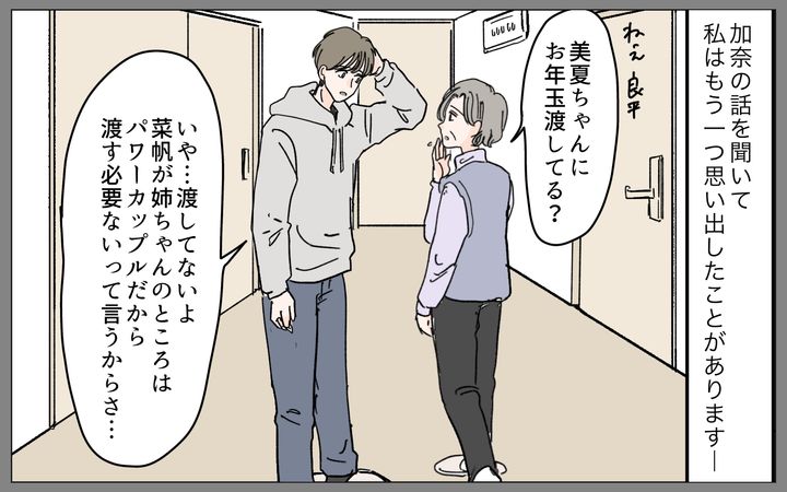 でも昨年、お年玉を美夏ちゃんに渡しているそぶりが見られず、思わず聞いたときには耳を疑いました。加奈の家は共働きで、良平も「収入がいいんだから、払ってもらってもいいんじゃないの?」という考えがあったかもしれません。でもその良平の考え自体も私がきちんと正すべきでした。