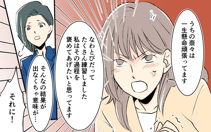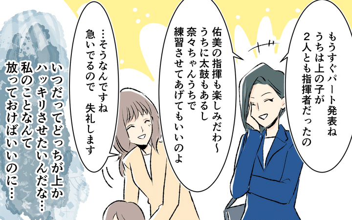 最近引越してきたばかりの真奈実。新しく入った保育園で娘・奈々は佑美と仲良くなるが、佑美のママ・美香は競争ばかり意識して人を見下すお受験ママだった。真奈実は距離を置こうと考えるが、子ども同士の仲がいいためか、美香は何かと絡んでくる。真奈実は美香に、奈々は小学校受験をしないと伝え、これで縁が切れるかと思いきや、週末に公園へ誘われて受験のためのトレーニングだという運動をさせられる。
