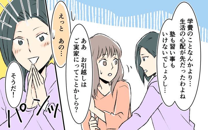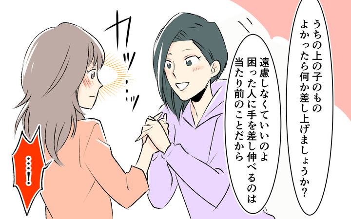 私がシングルマザーだとわかった途端、あからさまに見下した態度を取る美香さん。生活の心配や、お下がりをくれると言いますが、私にはただマウントを取りたいだけに見えました。