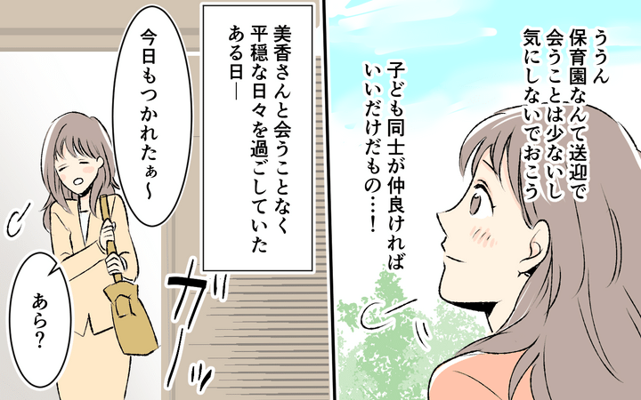 最近引越してきたばかりの真奈実。新しく入った保育園で娘・奈々が仲良くなった佑美のママ・美香はきつい性格だった。ほかのママさんたちからも煙たがられており、真奈実も距離を置こうと考えるが、「うちの子の仲良しのママ」認定されてしまう。