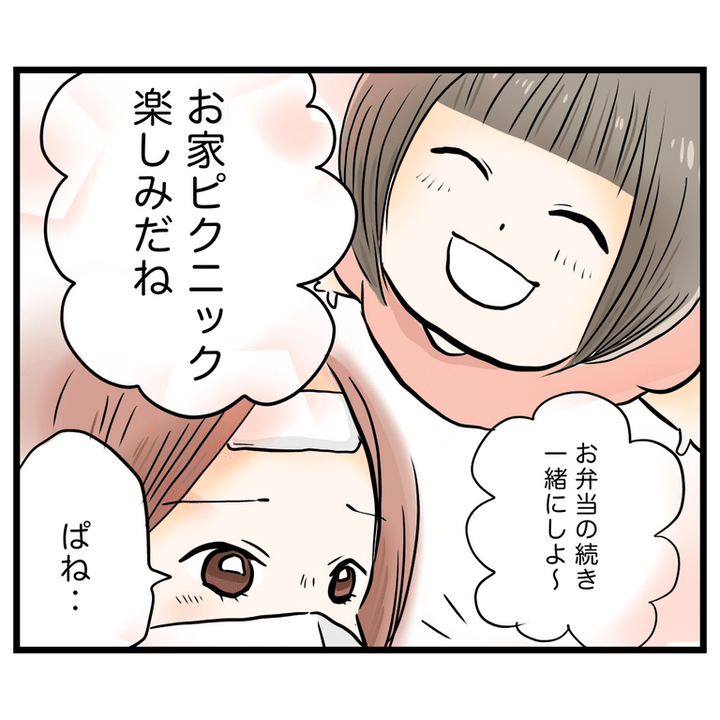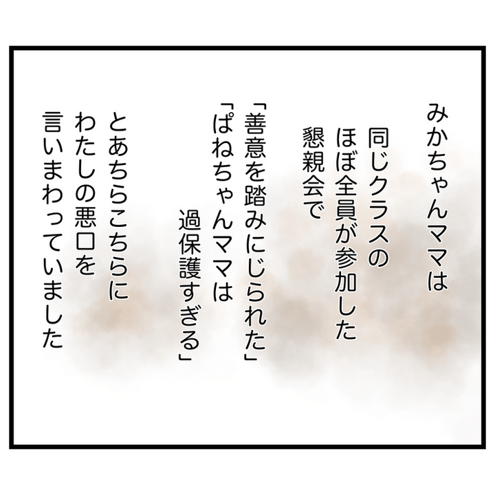 保育園の懇親会の直前に体調を壊してしまい、休むことにした主人公。しかしみかちゃんママは代わりに娘を連れて行くと勝手に決めて、当日の朝家の前まで来てしまいます。断る主人公に空き缶を投げつけてキレるみかちゃんママ。主人公が過保護で娘の自主性を育てていないと言うのでした。娘は家の中で夫に見てもらっていたのですが、家から出てきてしまいます。するとみかちゃんママは娘に「いっしょに行こう」と誘いますが、娘は「行かない」と答えたのでした。