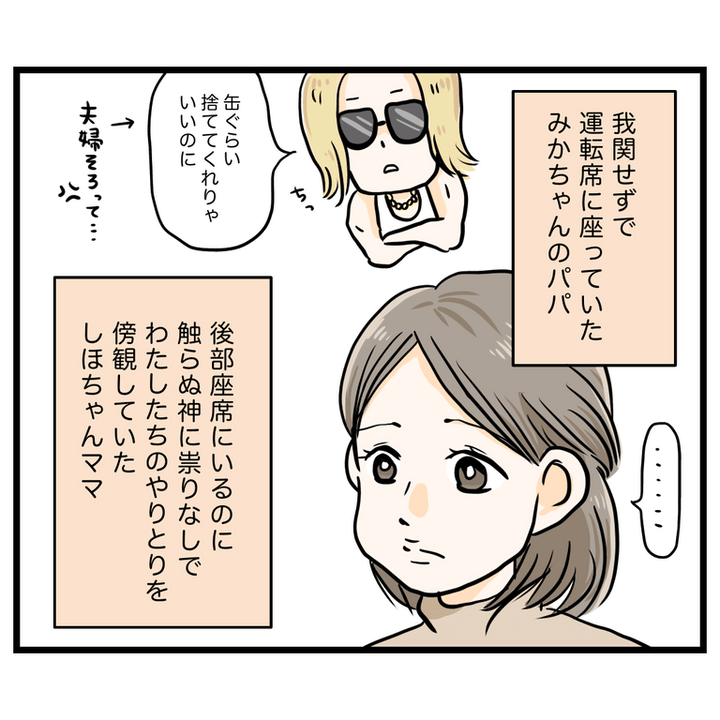 みかちゃんのパパが私が突きつけた缶を取ったので、これはさすがに奥さんに何かしら言うだろうと思ったら、まさかの「缶くらい捨てとけよ」とわたしに対する文句!