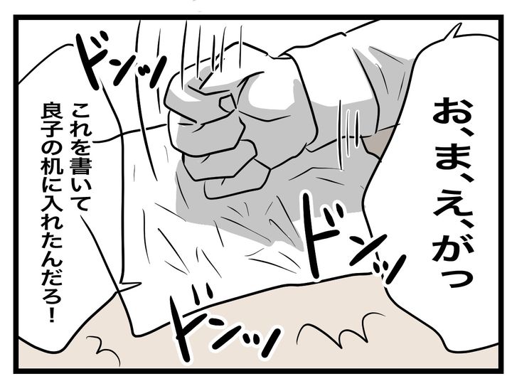 「お、ま、え、がっ これを書いて良子の机に入れたんだろ!」