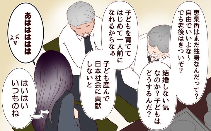 2. 「独身女は性格がきつい」法事でオジサンたちにからかわれた私は…<「子持ち様は迷惑」とキレる義妹 13話>【義父母がシンドイんです! まんが】