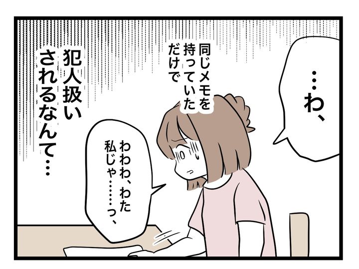 中学受験のため塾に通う小6のツム子は、少し前に上のクラスに上がって今はついていくのに必死だ。そんなある日、ツム子と同じクラスで成績がダントツ1位の良子が誰かから悪意のメモをもらったことで、テスト中に泣き出してしまう。自分がかわいがっている良子がいじめの対象となったことで激昂した先生は、すぐにクラス全員の荷物検査を実施。するとツム子の荷物から、良子宛のメモに使われていた同じメモ帳が出てきたことで、先生はツム子を加害者として別室に呼び出すのだった…。自分はやっていないと訴えるも信じてもらえず、同じメモ帳を持っていただけで「おまえが犯人だ」と詰め寄って来る先生に恐怖するツム子。どうしたらツム子の言うことをわかってもらえるのだろうか?