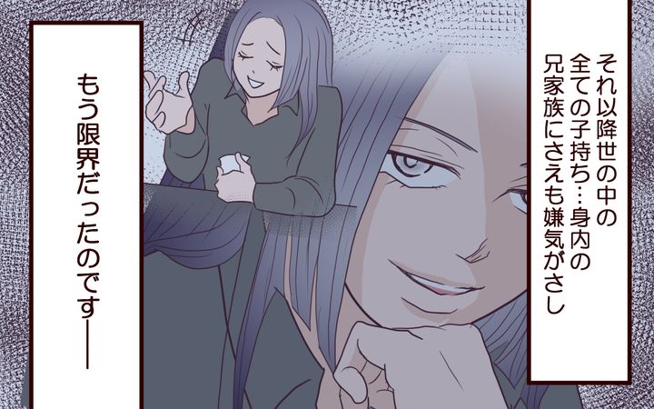 もう限界でした。子持ちへの嫌悪感は兄夫婦にも向かい、姪っ子に夢中になる両親にも当たり散らすようになっていき…。