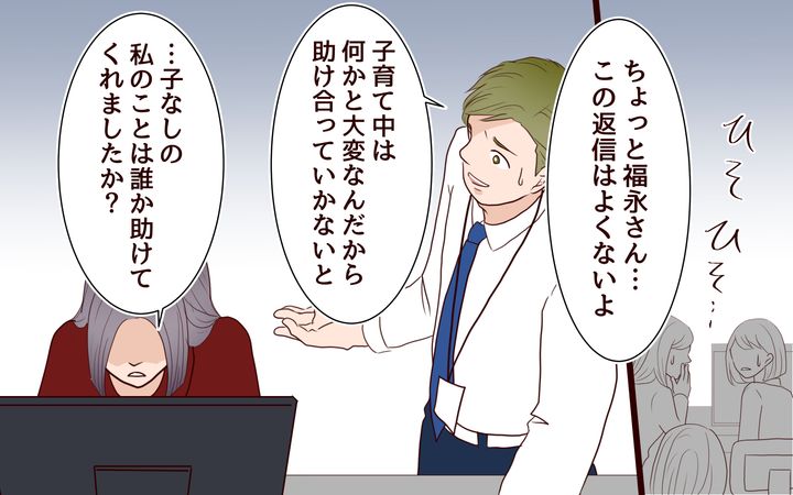 一方、恵梨香の職場は育児休暇や時短勤務者が多いのに人員補充がなく、独身者に負担がかかっている状態だった。推しのコンサートがあるときにもママ社員の仕事がまわってきて…。