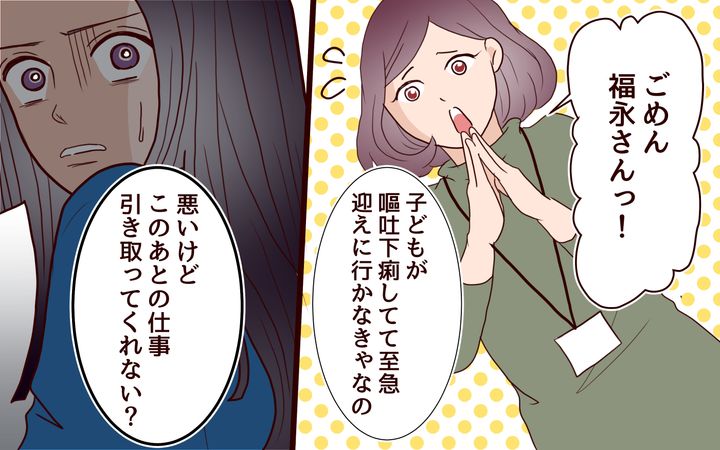 あるとき、酔った恵梨香が一方的に子持ちを悪く言うことに耐えられずに反論したさくら。すると、迷惑かけられている職場の同僚たちからは「ふざけるな」と思われているという言葉が返ってくる。そのため、さくらは気を遣って仕事に取り組んでいたが、後輩たちは「人員の体制が整っているから」とママ社員に協力的だった。