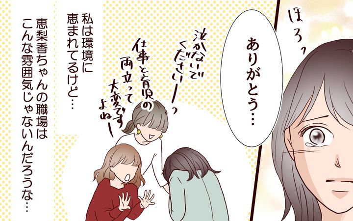 仕事と育児の両立で疲れがピークに達していたころ、後輩たちから「そんなに謝らないで」と言われ…泣いてしまいました。誰が休んでも対応できる体制にある私の職場は、きっととても恵まれた環境なのでしょう。