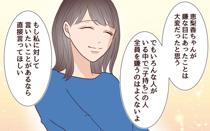 いろんな人がいるなかで、恵梨香ちゃんが「子持ち」の人全員を嫌うのはちょっと違うんじゃないかと、私は思っていることを伝えました。
