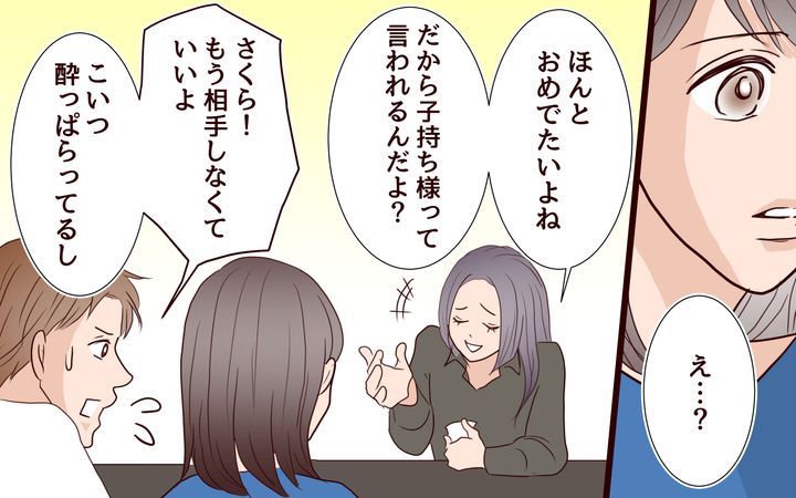 義父の誕生日会で久しぶりに恵梨香に会うと、酔った義妹は「子持ち様は傲慢」と言いたい放題。それに対して夫や義母が見当違いな反論をしたため、恵梨香の罵詈雑言はどんどんエスカレート。「子持ちは仕事辞めるべき」と言われ、たまりかねたさくらは…。
