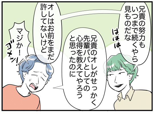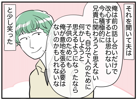 義兄嫁は、息子と出会わせてくれた義兄に感謝しているといい、それだけで離婚しない理由になるという。それから1年後、再構築の道を選んだ義兄は心を入れ替え、家事に育児に精一杯励んでいるようで…。