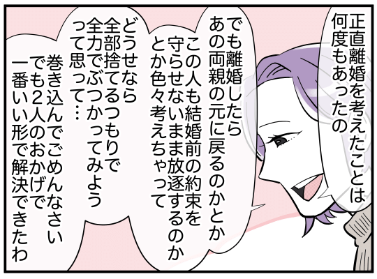 義兄嫁両親、そして義母との関係は、未だ完全な解決とは言えませんが、この2人ならきっと協力して幸せを手に入れることができるのではないでしょうか。