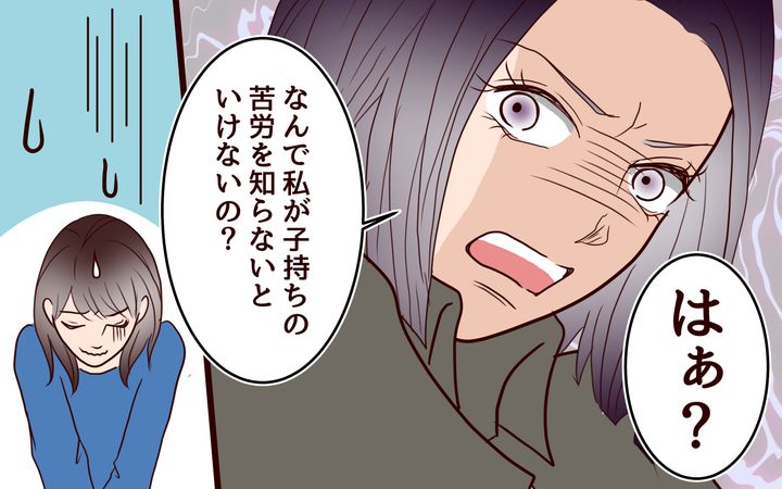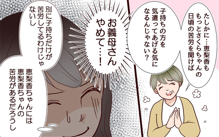 ある日、義実家へ遊びに行くと、居ないはずの恵梨香が在宅。家がうるさくなったと怒り出し、「子持ち様は非常識」とさくらに嫌味を言って家を出ていく。