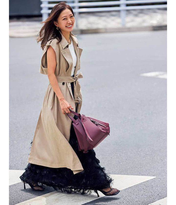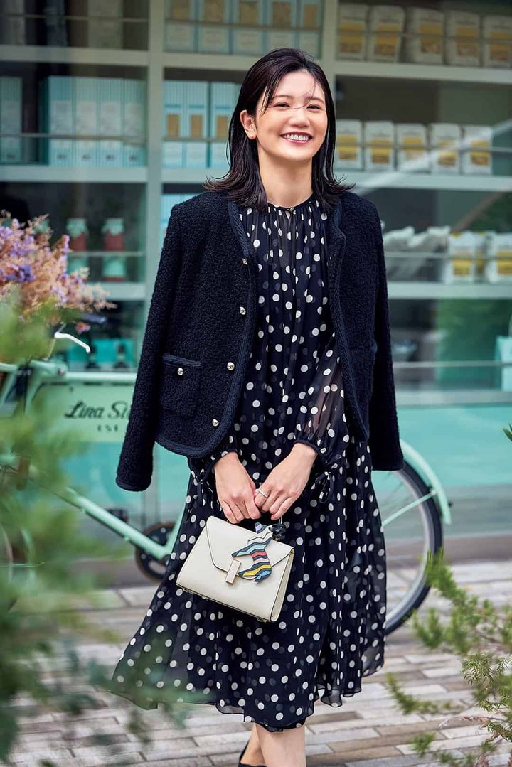 「普段は、実際の性格である「運動家」らしく、甘さを盛った〝ほぼクロ〟が多め。女子会へ行く時は、自分の気持ちに正直に、柄や素材で高揚感を足し、オシャレを楽しみます。