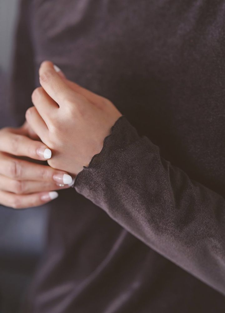 ベロアの艶とシャギーのふわもこ感が好相性。ブラウン×白の異素材ミックスが、冬の装いを軽やかにアップデートしてくれます。さりげない甘さを効かせた上品フェミニンコーデです。
